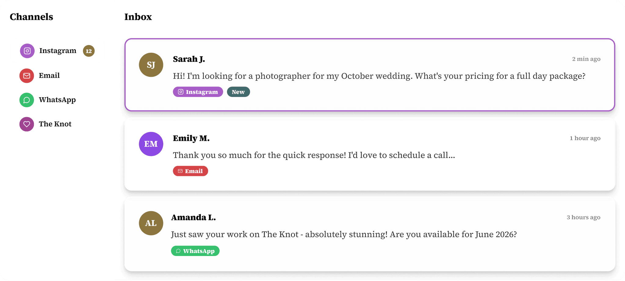 It's 2 AM. You're editing. Your phone buzzes. It's an inquiry on Instagram. You think "I'll reply later." Three days later, you remember. But she already booked someone else.